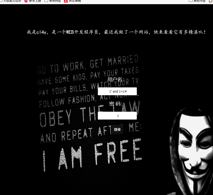 那我们只要把最后的引号注释掉就可以正常执行了,URL后加上?username=admin’ and 1=1#,这时候SQL语句为select * from table where username=’admin’ and 1=1#’,而#为注释符号,执行语句时会忽略#后面的部分,在这里就是忽略最后的’,则最后能够正常执行,结果与(1)相同