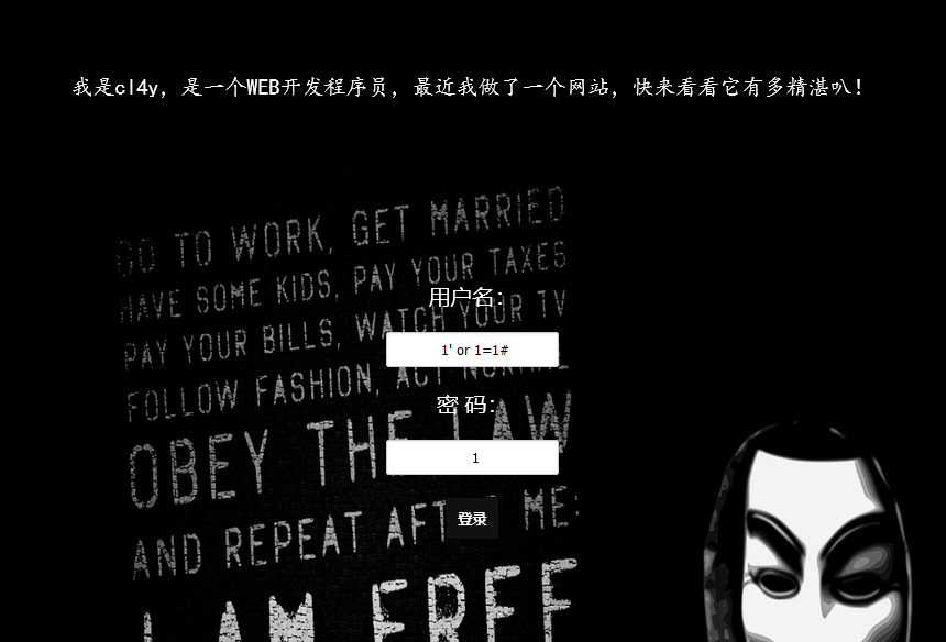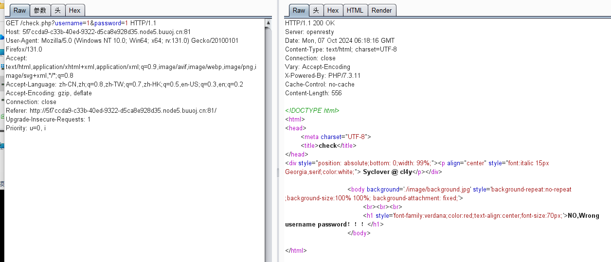 先是抓包正常输入username=1,password=1看一下正常页面是怎么样的