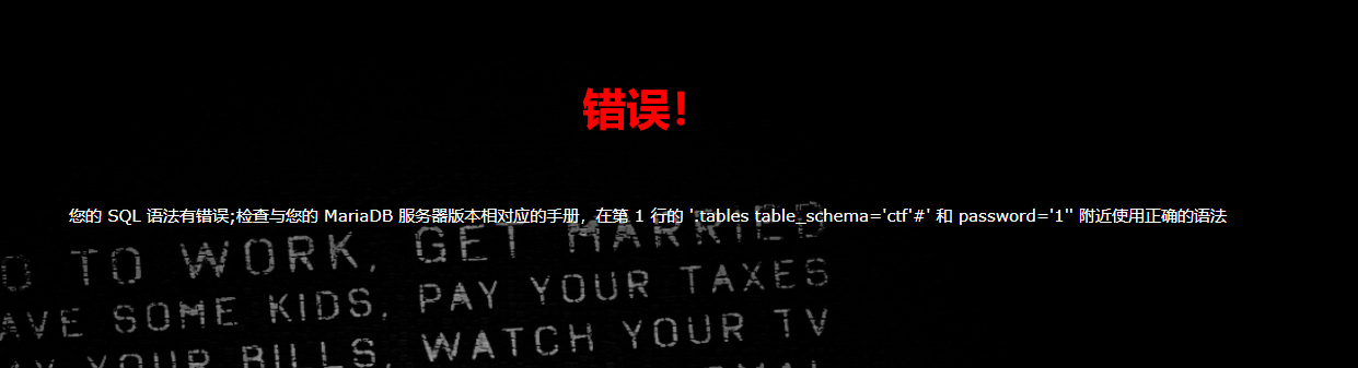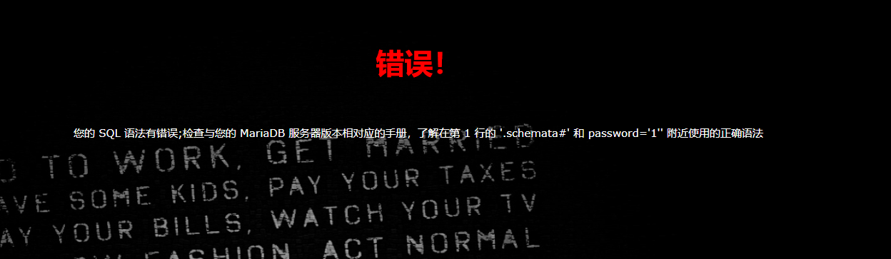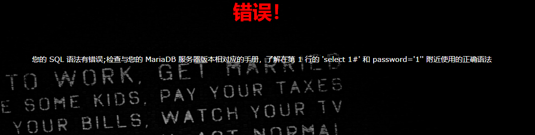 当我们输入1’ union select 1#时,会显示第一行1#附近有语法错误,这时候就是对1#前面的数据进行了过滤,这时候我们双写一下试试1’ ununionion selselectect 1#