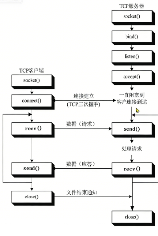 TCP开发流程 服务端:socket()->bind()->listen()->accept()->等待连接->(send()<=>recv())->close() bind()指定服务端(ip,端口号),listen()最大监听数(最大数为128),accept()等待监听(会返回一个包含负责和客户端交互的socket与客户端信息的元组,也称为connection对象),即当客户端开始连接时,会分配单独的socket对象与客户端做交互 send(data)发送数据(data为bytes二进制形式),recv(bufsize)接收数据(返回bytes二进制形式,bufsize指定最大的数据量),close()关闭连接,对服务端来说关闭的是那个单独的socket 客户端:socket()->connect()->(recv()<=>send())->close() connect()向(ip,端口号)发起连接 除上述外还有同时应用于服务端/客户端的函数为**setsokopt(level,optname,value)**用于设置端口号复用,当程序结束后立即释放端口号,level=SOL_SOCKET(当前套接字对象),optname=SO_REUSEADDR(重用端口),value=True